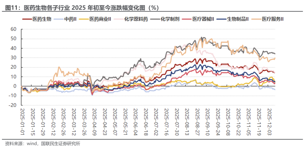 化学制剂年度涨跌幅行业内领先。2025年初至今表现最好的子行业为化学制剂,上涨31.62%;表现最差的为中药II,下跌3.38%。其他子行业中,医疗服务II较年初30.42%,医药生物较年初14.49%,化学原料药较年初15.02%,生物制品II较年初4.38%,医药商业II较年初9.77%,医疗器械II较年初4.45%。