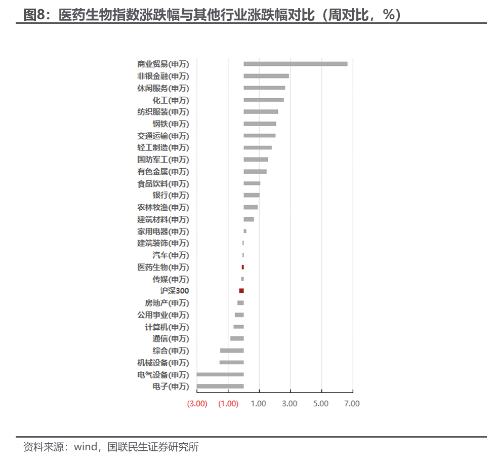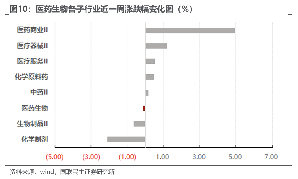 子行业方面,当周(12.15-12.19)表现最好的为医药商业II,环比+4.94%;表现最差的为化学制剂,环比 -2.10%。