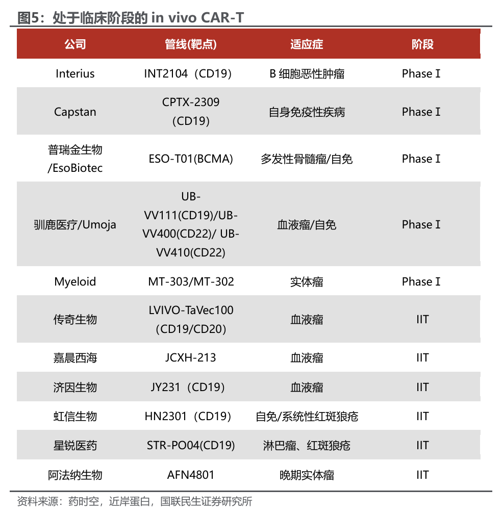 In vivo CAR-T技术路线分为病毒载体和非病毒(LNP)两种,适应症有望拓展到自免和实体瘤治疗领域。已经有10个in vivo CAR-T处于临床阶段,并且疗效得到初步验证: