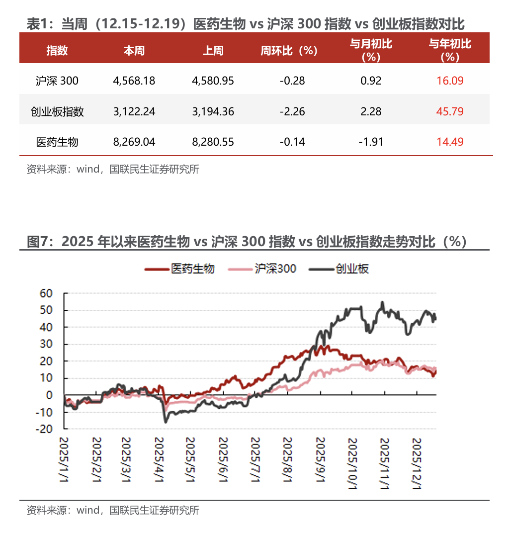 当周(12.15-12.19)医药生物指数环比-0.14%,跑赢创业板指数和沪深300指数。当周医药生物指数周环比-0.14%,沪深300指数周环比-0.28%,创业板指数周环比-2.26%,医药跑赢沪深300指数0.14个百分点,跑赢创业板指数2.12个百分点。2025年初至今医药生物上涨14.49%,沪深300上涨16.09%,创业板指数上涨45.79%,医药跑输沪深300指数,跑输创业板指数。