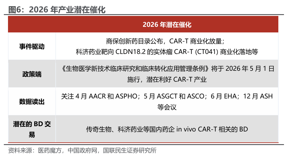 In vivo CAR-T赛道处于产业发展的初期阶段,无论是BD交易的发生,支持政策的落地,或者临床数据的读出等均有望加速行业的发展。密切关注2026年潜在发生的催化事件。