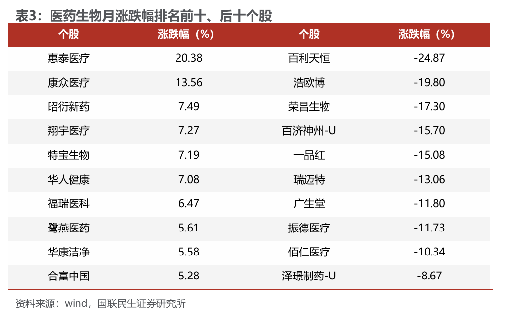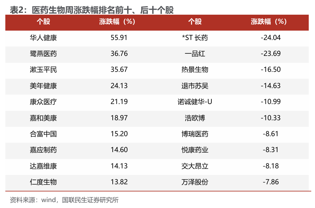 当周(12.15-12.19)涨跌幅排名前5为华人健康、鹭燕医药、漱玉平民、美年健康、康众医疗。后5为*ST长药(维权)、一品红、热景生物、退市苏吴(维权)、诺诚健华-U。滚动月涨跌幅排名前5为惠泰医疗、康众医疗、昭衍新药、翔宇医疗、特宝生物。后5为百利天恒、浩欧博、荣昌生物、百济神州-U、一品红。