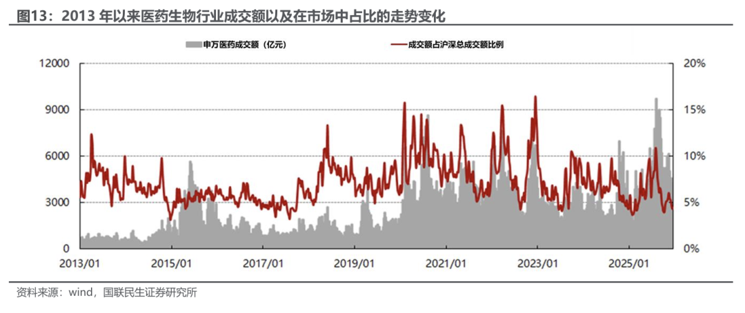 当周(12.15-12.19)医药行业交易金额较上一周下降。医药成交总额3898.24亿元,沪深总成交额为86901.56亿元,医药成交额占比沪深总成交额比例为4.49%(2013 年以来成交额均值为 7.12%)。