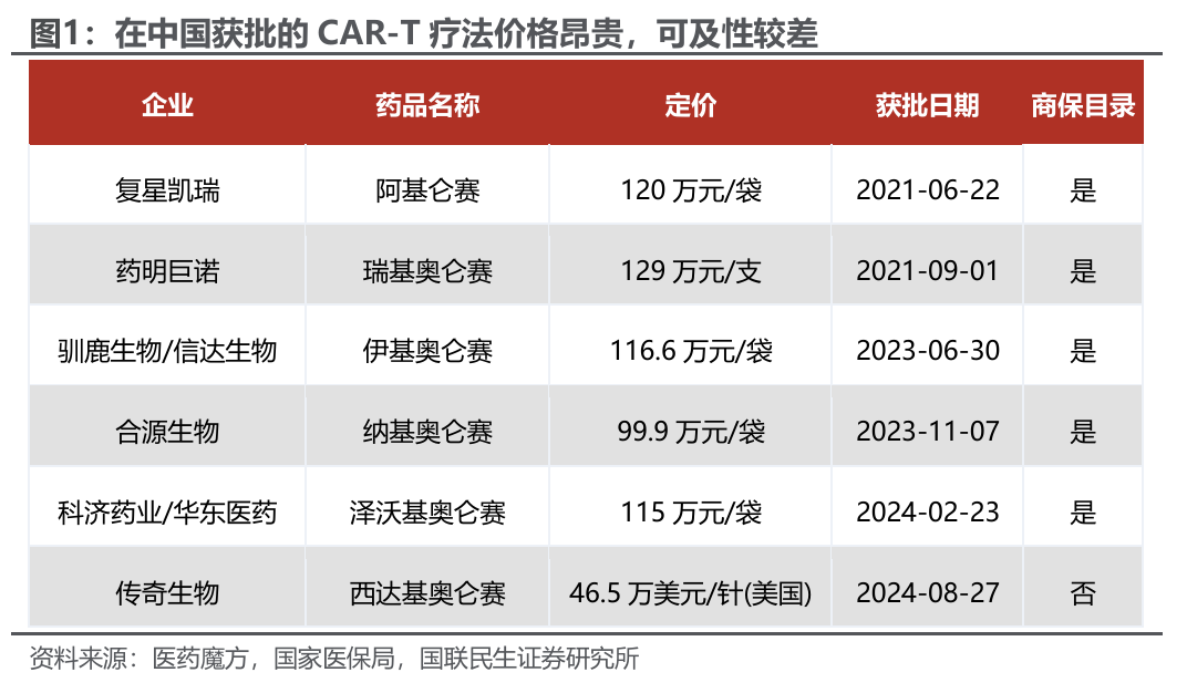 CAR-T细胞疗法为对抗无法治愈的癌症提供了一种潜在的变革性方法。 国内已有六种细胞治疗药物获得批准,细胞治疗疗法与标准治疗方案相比显示出更优的疗效,并且通常具有可接受的风险效益特征。但是因为细胞疗法属于个性化治疗方式,治疗成本极为高昂,整个疗程费用可达上百万元,这极大地限制了可受益的患者人群。